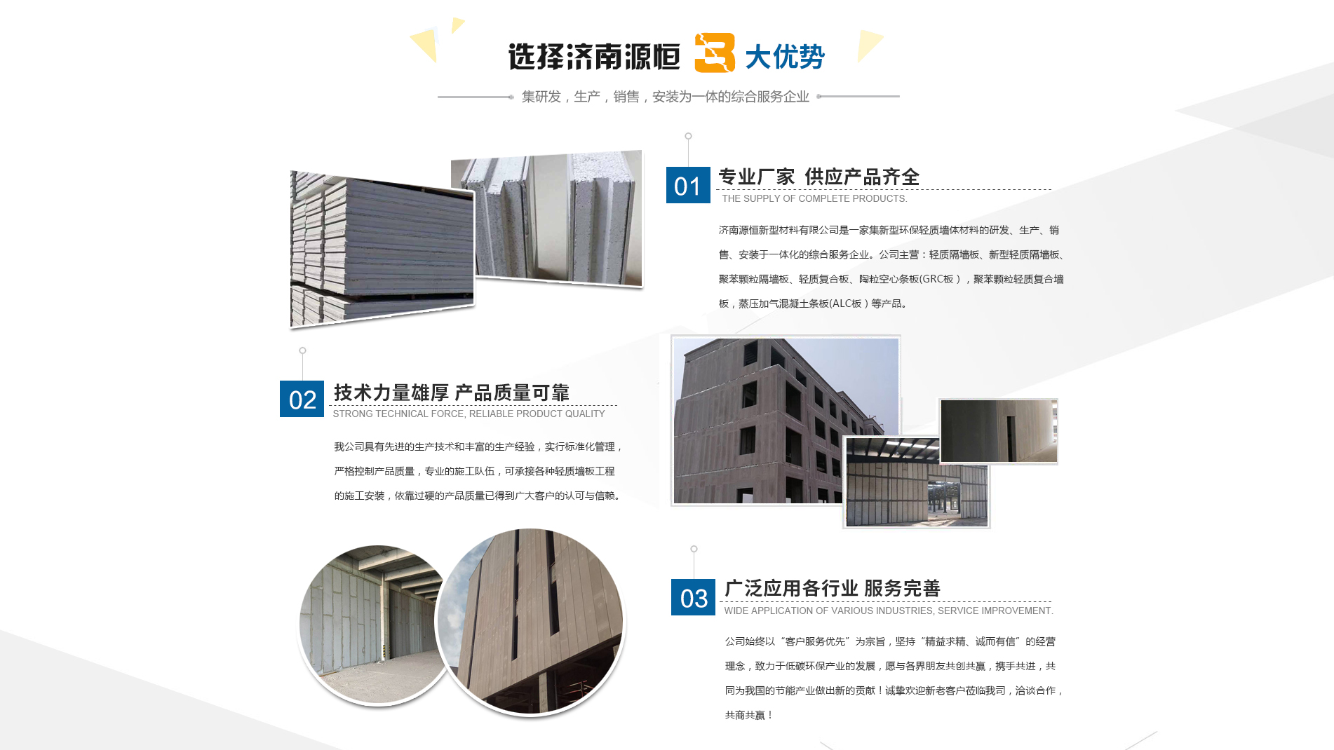濟(jì)南源恒新型材料有限公司坐落于美麗的泉城濟(jì)南,是集新型環(huán)保輕質(zhì)墻體材料的研發(fā)、生產(chǎn)、銷售、安裝于一體化的綜合服務(wù)企業(yè)。我公司具有的生產(chǎn)技術(shù)和豐富的生產(chǎn)經(jīng)驗(yàn),為您提供輕質(zhì)隔墻板、新型輕質(zhì)隔墻板、聚苯顆粒隔墻板、輕質(zhì)復(fù)合板、陶粒空心條板(GRC板),聚苯顆粒輕質(zhì)復(fù)合墻板,蒸壓加氣混凝土條板(ALC板)等產(chǎn)品,本公司有專的施工隊(duì)伍,可承接各種輕質(zhì)墻板工程的施工安裝。輕質(zhì)隔墻板是國(guó)家推廣使用的新型輕質(zhì)、綠色無(wú)害建材,是墻改節(jié)能政策大力扶持的環(huán)保節(jié)能產(chǎn)品,是發(fā)達(dá)國(guó)家普遍采用的新型墻體材料。濟(jì)南源恒新型材料有限公司實(shí)行標(biāo)準(zhǔn)化管理,嚴(yán)格控制產(chǎn)品質(zhì)量,依靠過(guò)硬的產(chǎn)品質(zhì)量已得到廣大客戶的認(rèn)可與信賴。公司產(chǎn)品遍布各大城市,與國(guó)內(nèi)多家客戶建立了良好的合作關(guān)系。公司始終以“客戶服務(wù)優(yōu)先”為宗旨,堅(jiān)持“精益求精、誠(chéng)而有信”的經(jīng)營(yíng)理念,致力于低碳環(huán)保產(chǎn)業(yè)的發(fā)展,愿與各界朋友共創(chuàng)共贏,攜手共進(jìn),共同為我國(guó)的節(jié)能產(chǎn)業(yè)做出新的...